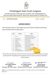 प्रदेश युवा कांग्रेस ने जारी किया नियुक्ति आदेश