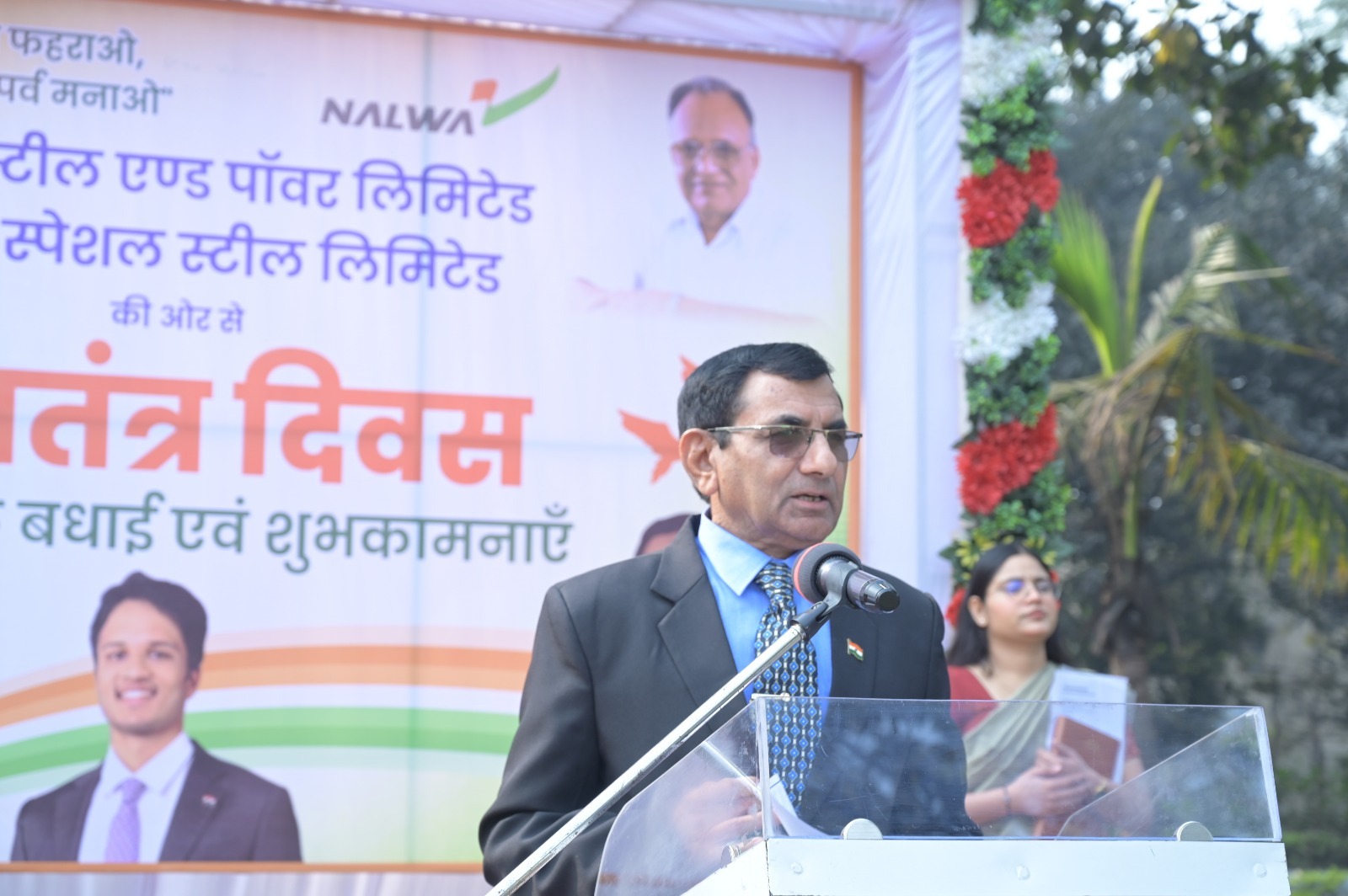 डॉ. एस एस राठी जी ने अपने संबोधन में कहा की परम आदरणीय संस्थापक चेयरमैन श्री बाउजी के आशीर्वाद एवं आदरणीय चेयरमैन श्री नवीन जिंदल जी के विज़न और वैल्यूज पर चल कर नलवा स्टील ने अनवरत अच्छा प्रदर्शन किया है एवं निरंतर प्रगति के पथ पर अग्रसर है साथ ही राष्ट्र निर्माण में अपना योगदान दे रहा है। हम सभी मिलकर देश को आत्म निर्भर बनाने के बाउजी के सपने को साकार कर रहे हैं। डॉ. एस एस राठी जी ने चेयरमैन श्री नवीन जिंदल जी के राष्ट्रीय ध्वज को आम नागरिकों को ध्वज फहराने के अधिकार के लिए किए गए संघर्षों के बारे में बताया कि भारतीय लोकतंत्र के इतिहास में रायगढ़ जिले का एक महत्वपूर्ण स्थान है। यही वह पवित्र भूमि है, जहां चेयरमैन श्री नवीन जिंदल जी ने अपने राष्ट्रीय ध्वज तिरंगे को सरकारी तंत्र से आजाद कराने का संघर्ष शुरू किया था और 23 जनवरी 2004 में सभी भारतवासियों को राष्ट्रीय ध्वज फहराने का अधिकार मिला इसके लिए आदरणीय चेयरमैन श्री नवीन जिंदल जी का आभार व्यक्त किया।